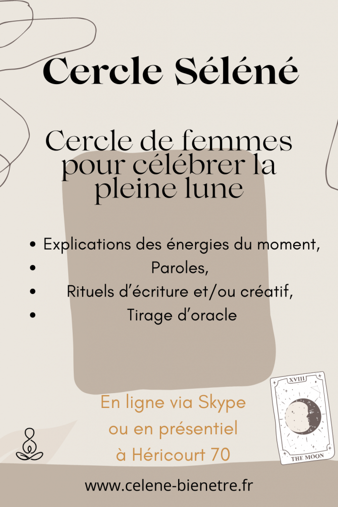 Le Cercle de femmes Séléné, nommé d’après la déesse de la Pleine Lune dans la mythologie grecque, est un rassemblement pour célébrer la pleine lune. Il sert à exprimer de la gratitude pour les événements passés et à lâcher prise sur ce qui doit être abandonné. Chaque cercle est unique, avec des thèmes variés en fonction du signe astrologique de la Pleine Lune, de la saison, et des fêtes païennes à venir, entre autres.